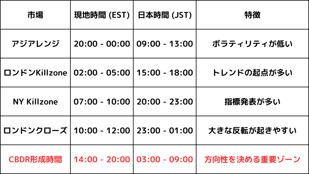 Central Bank Dealers Range(CBDR)は、ICTが教える重要な価格帯の概念で、デイトレード戦略の出発点としてよく使われます。CBDRとは一日の中でどこからどこまでがスマートマネーが価格を設計する中心的なレンジかを示すものです。CBDRはNY時間の午後2時から8時にかけて形成される高値と安値を使って算出します。ICTによると、この6時間の間に中央銀行ディーラーがポジションを仕込むとされる時間帯で、その日の方向性を決める重要レンジになります。このCBDRを基準にすることで、日中における高確率な売買ゾーンを見極めることが可能になります。