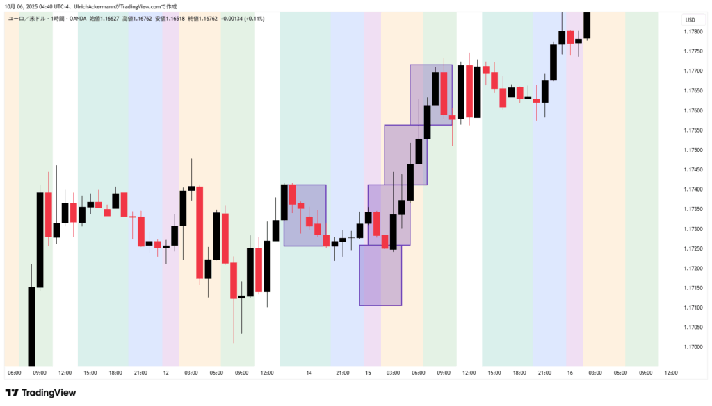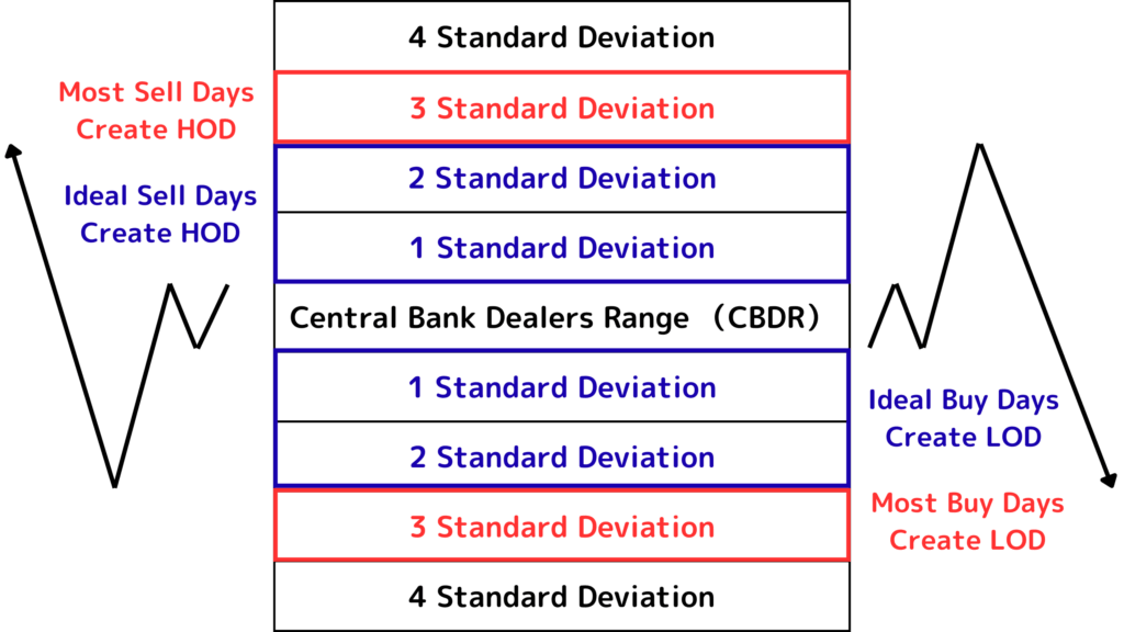 下側(-Standard Deviation)買い優勢ゾーン 下方向の1αから4σは、価格がCBDRを下抜けした場合のターゲットを示します。多くの場合、1σまたは2σ付近で安値形成(LOD:LOW OF DAY)を作りやすいです。特にMost Buy Days Create LODやIdeal Buy Days Create LODは下のゾーンで作られ、スマートマネーがリテールの売りを誘ってから買いを仕掛ける狩り場になりやすいです。