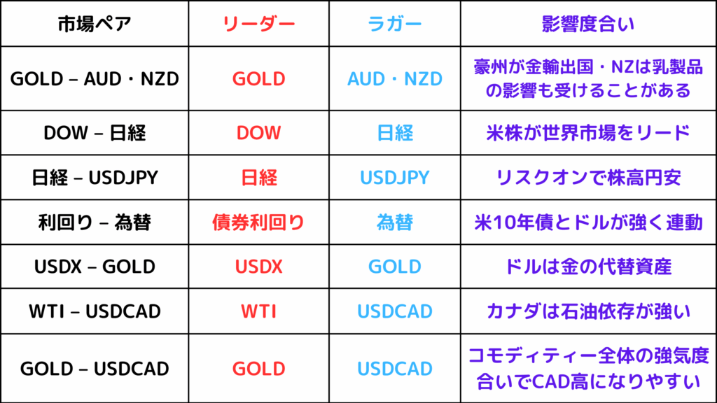 ゴールド(リーダー) vs USDCAD(ラガー) ゴールド価格上昇は、資源国通貨CADを押し上げ、結果的にUSDCADペアは下落します。ゴールドとCADは商品サイクルによって強弱が変わります。