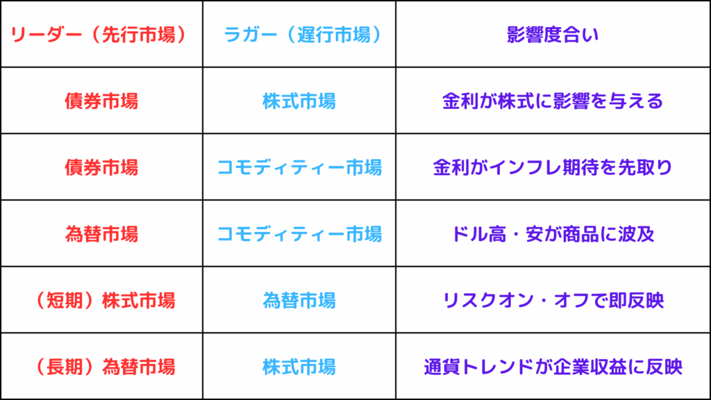 為替市場(リーダー) vs コモディティー市場(ラガー) 為替はグローバル資本フローを直接反映するため、商品市場に先行することが多いです。短期的には、商品価格が急変すると為替が後追いする場合もあります。