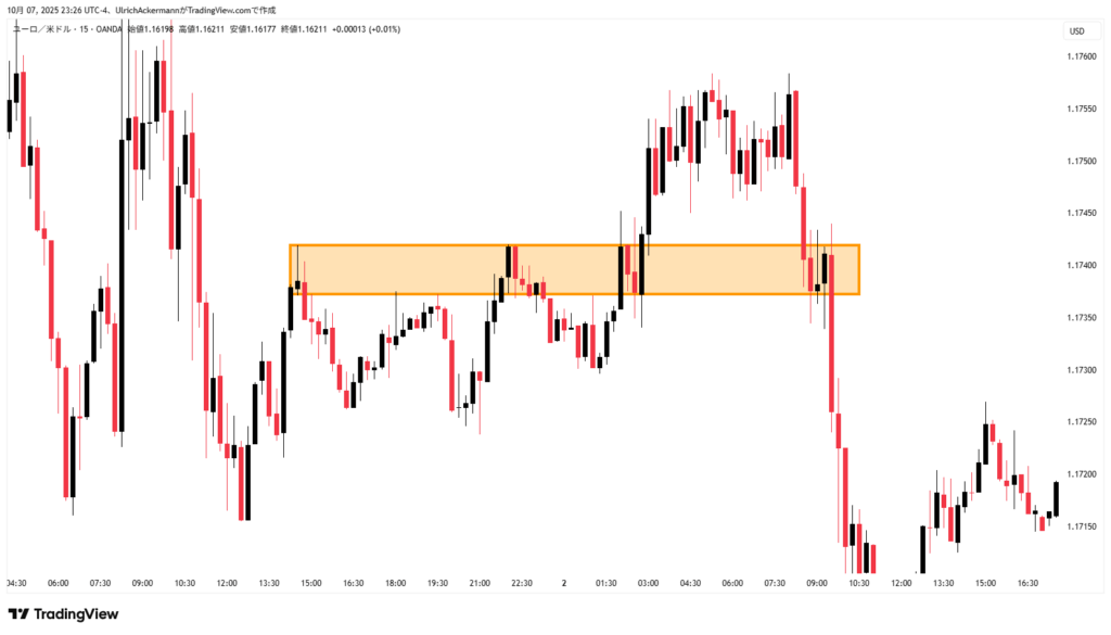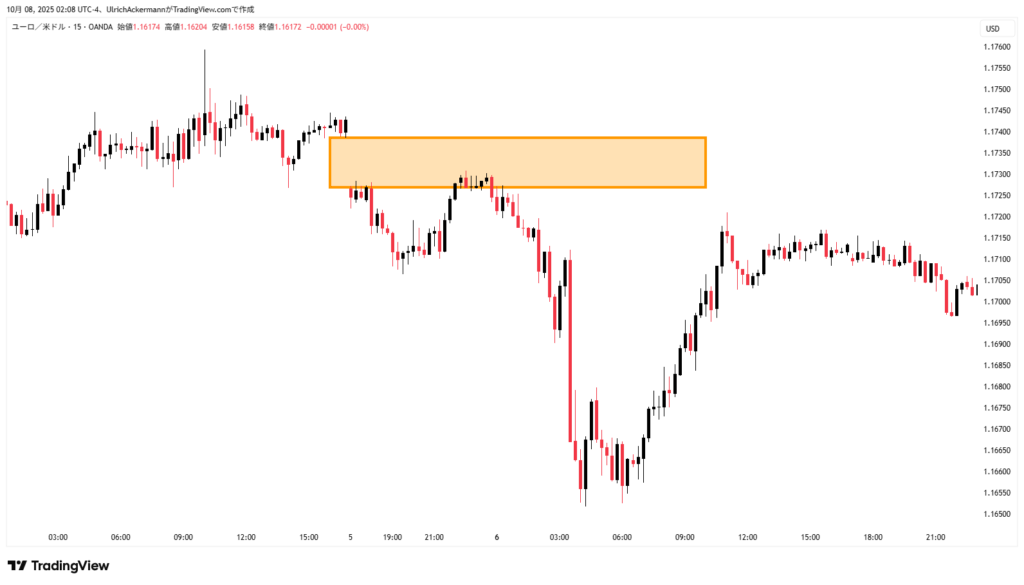 バキューム・ブロックとは、価格が急速に走った結果、売買がほとんど成立していない空白のゾーンを指します。これは通常、高ボラティリティのイベント(FOMC・NFPなどの経済指標発表、週明けの窓開け、取引セッション開始直後など)で発生し、マーケットが一気に動いたときに形成されます。