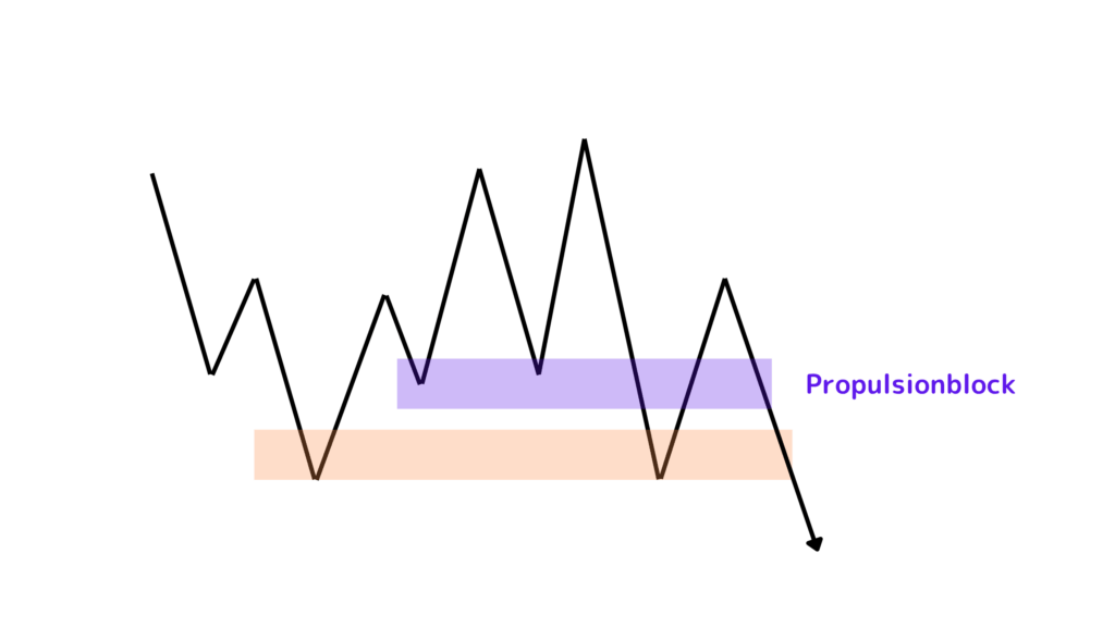 プロパルション・ブロックとは、価格がオーダーブロックに触れたあと、勢いよく反発して強い方向性を示す直後のローソク足を指します。これは、スマートマネーが大量の注文を投入し、マーケットに一気にモメンタムを与える瞬間を捉えるための概念です。