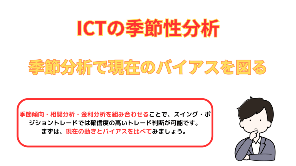 ICTでは金利分析と季節傾向分析を同じ基準で考えながら、エントリー判断に活かしていきます。つまり、短期のテクニカルシグナルだけでなく、時間の流れに応じた季節的なサイクルや市場参加者の行動パターンを理解しておくことが重要です。
