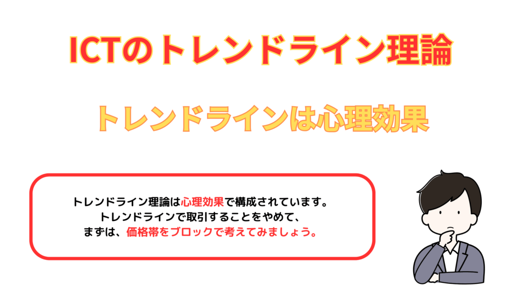 トレンドラインは万能ではない 初心者はトレンドラインを万能だと思いがちですが、単独では信頼性が低いです。必ずオーダーブロック、リクイディティプール、フェアバリュー・ギャップなど、ICTの他の概念と組み合わせて考える必要があります。